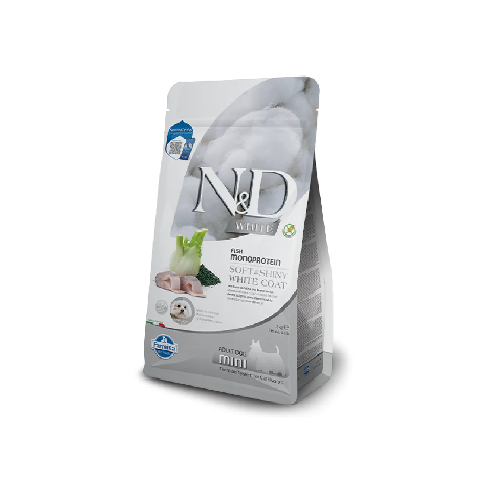Farmina ND White Coat Mini Monoprotein Spigola Spirulina e Finocchio è un alimento studiato per i cani di taglia piccola con manto bianco.