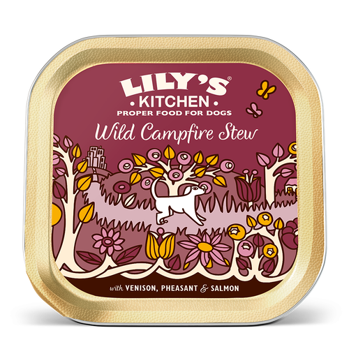 Lily’s Kitchen WILD CAMPFIRE STEW è un cibo umido per cani a base di cervo, fagiano e salmone addizionato con verdura biologica ed erbe botaniche di elevata qualità senza cereali (grain free), ideale anche per quei cani che potrebbero essere allergici o intolleranti alle tradizionali fonti proteiche.