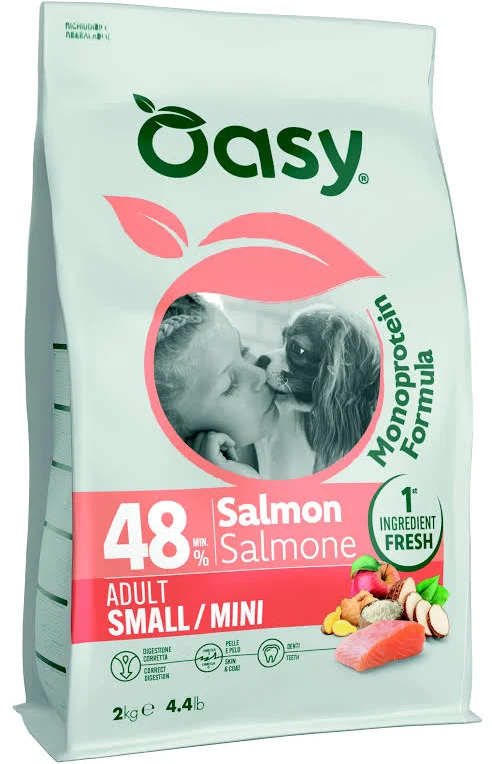 Le crocchette al salmone Oasy adult small mini salmpon contengono soltanto una solo proteina animale quindi molto valide per le diete ad esclusione.