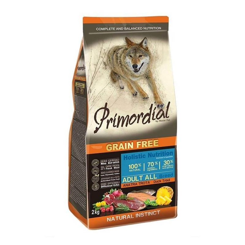 Le crocchette Primordial Anatra e Trota sono studiate per soddisfare le esigenze dei cani di taglia media e grande e sono realizzate In Italia con ingredienti cucinati rigorosamente a vapore.