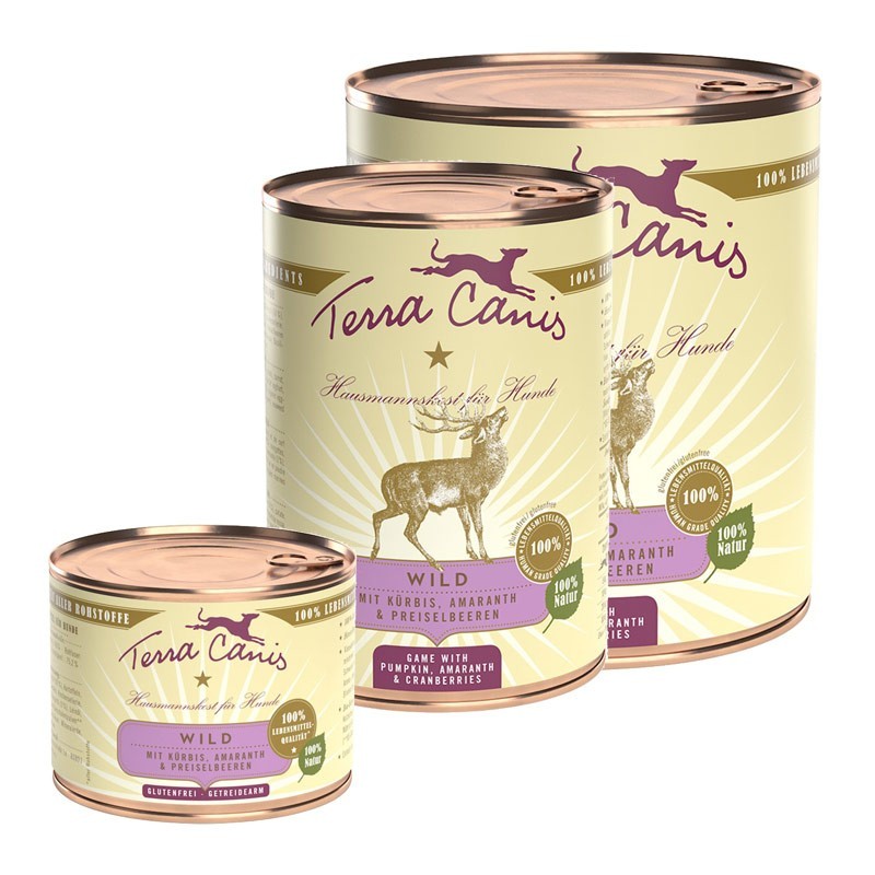 Il cibo umido a base di carne pura di selvaggina Terra Canis è un alimento prodotto da carne di selvaggina 100% certificata per la sua qualità, pari a quella destinata al consumo umano. La carne di muscolo di cervo è impiegata esclusivamente fresca, senza aggiunta di farine di carne e di ossa, né di scarti alimentari o parti di carne di qualità inferiore. Questo cibo umido per cani contiene pochi grassi e molte proteine nobili che, combinate con gli acidi grassi insaturi e gli omega 3 dell’olio di lino, aiutano il tuo animale adulto a tenersi attivo, a preservare la muscolatura e la pelle e a mantenere il pelo lucido e sano. Gli ingredienti vegetali, fra cui zucca, mirtillo rosso, amaranto, patate, barbabietola, erba cipollina, basilico, alghe e altri, sono freschi e ricchi di nutrienti che contribuiscono in maniera decisiva a coprire il fabbisogno giornaliero di fibre, sali minerali, vitamine e sostanze antiossidanti, indispensabili per il funzionamento di ogni apparato e organo del tuo animale. Terra Canis non usa additivi, conservanti, coloranti e altre sostanze non naturali. Questa formulazione con carne pura di selvaggina include una quantità ridotta di cereali ed è completamente priva di glutine e di OGM. Gli ingredienti sono cotti con sistemi di cottura delicati, per non rovinarne le qualità organolettiche e nutrizionali. Con questa ricetta, il tuo cane sarà soddisfatto dal pasto bilanciato, completo, energetico e gustoso e farà il pieno di sostanze nutritive di alto valore biologico.