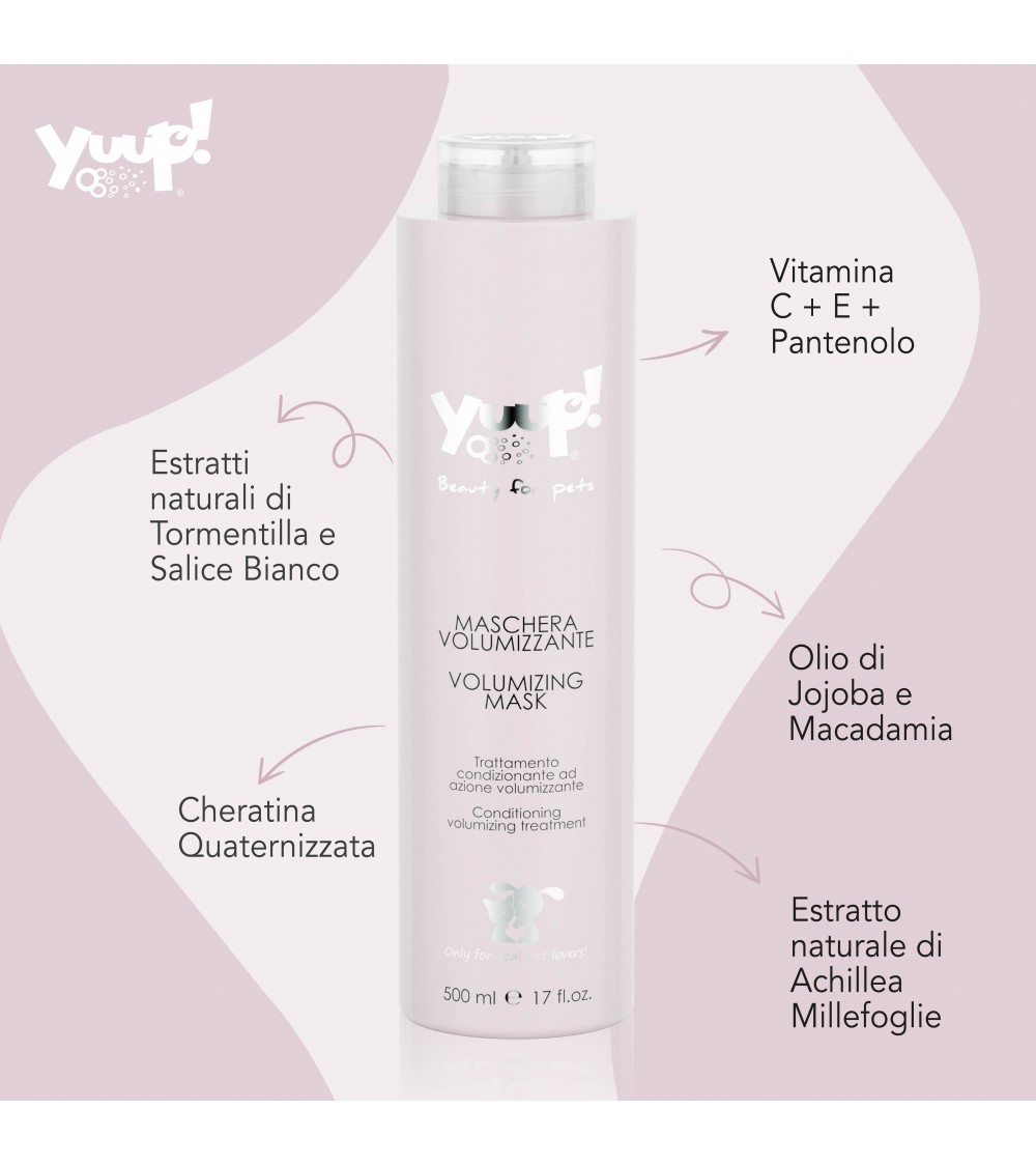 Yuup Maschera volumizzante è un Trattamento condizionante per cani specifico per le razze a pelo riccio o liscio che necessitano di volume e leggerezza.